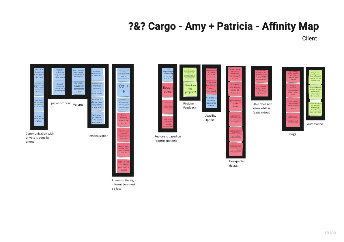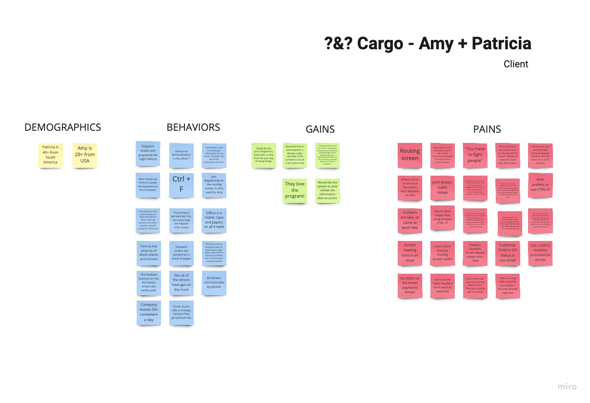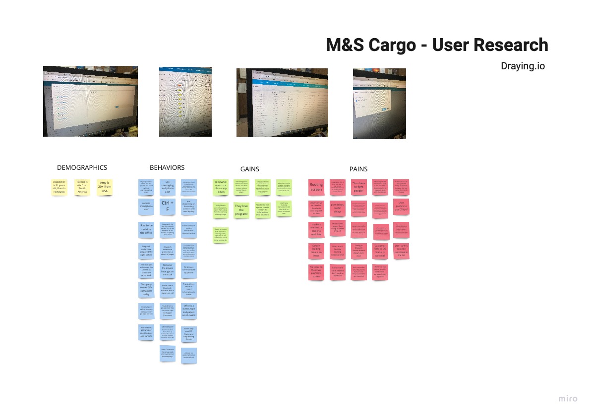 Highly intelligent dispatchers, that have become used to having all the moving processes and calculations done manually; they have sheets of information posted all along the office, as a backup system to what they do on the spot. Spending time with them required not getting in the way of their busy and hectic schedule. After a lot of probing since they felt that the previous 6 months with the Client had been enough to take care of the pain points, I was able to find nuggets of information.